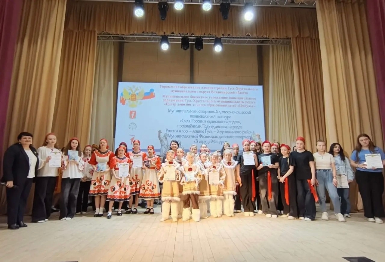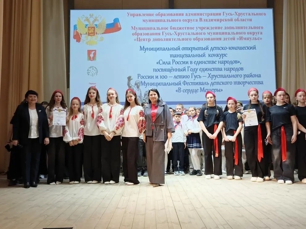 23 апреля 2026 года в стенах Центра культурного развития Гусь-Хрустального округа состоялся муниципальный открытый детско-юношеский танцевальный конкурс «Сила России в единстве народов». Мероприятие прошло в рамках фестиваля детского творчества «В сердце Мещеры» и было посвящено Году единства народов России и 100-летию Гусь-Хрустального района.